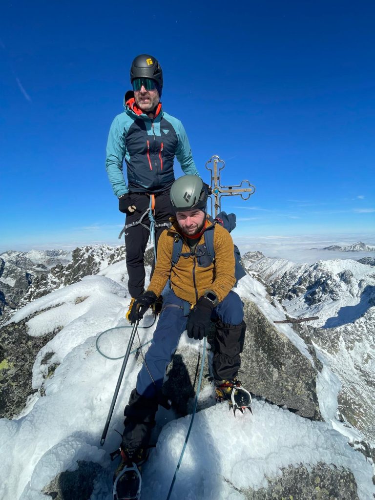 Druhá akce už byla úspěšnější. Minulý rok jsme dostali poukaz na výstup na Gerlach s horským vůdcem, který jsme využili až letos. Opět to bylo v závěru letní sezony (12. října) a opět to byl spíš zimní výstup, tentokrát ale úspěšný, protože počasí přálo. Mám tedy i vrcholové foto s křížem, bohužel na žádné z fotek toho dne nevypadám inteligentně. Ještě že se neživím jako model či influencer.